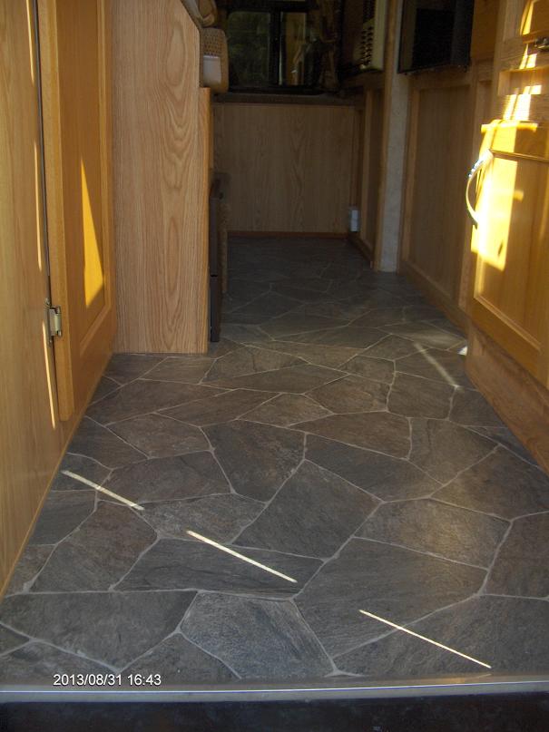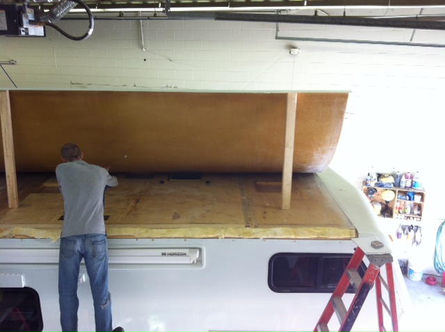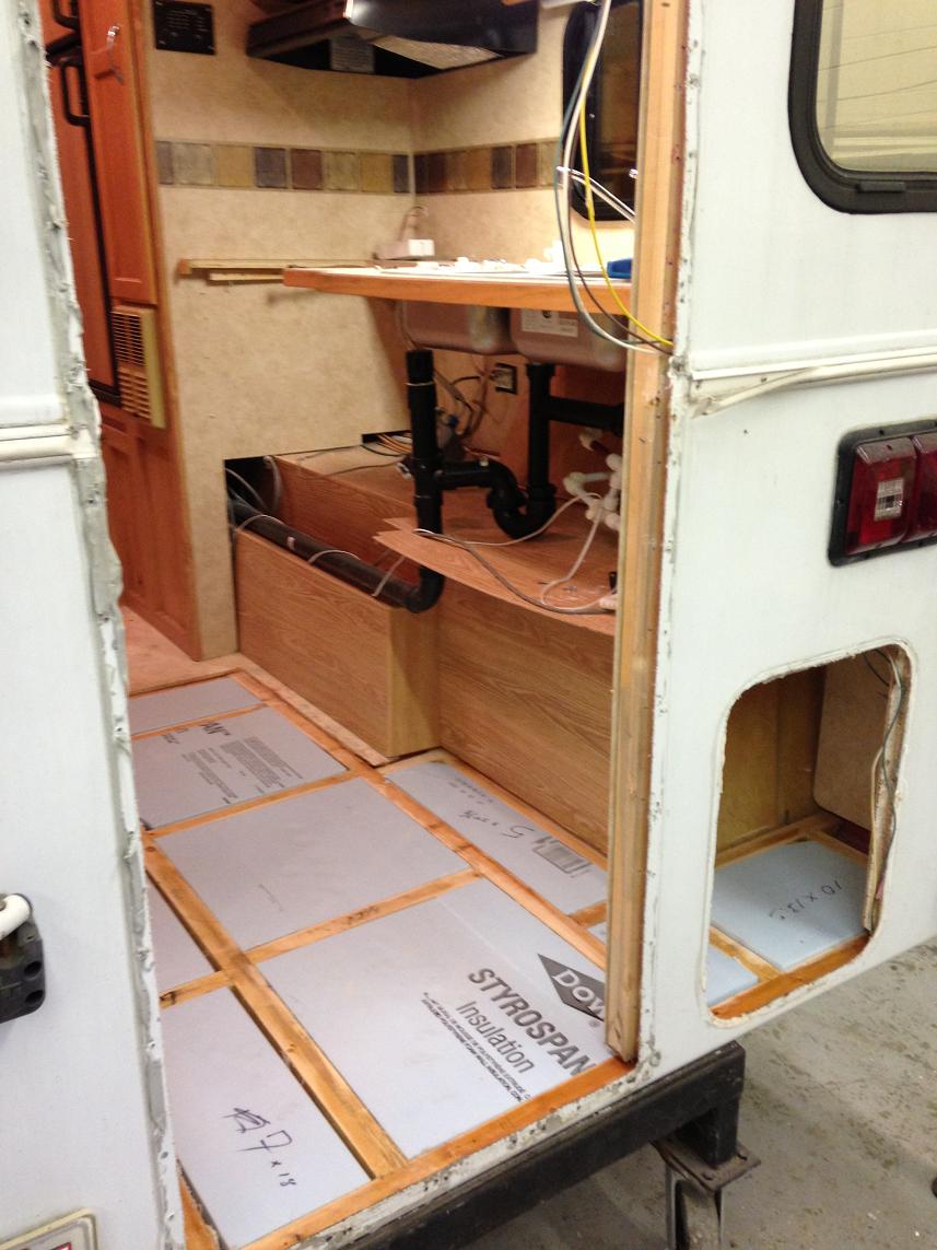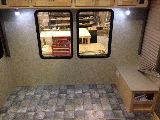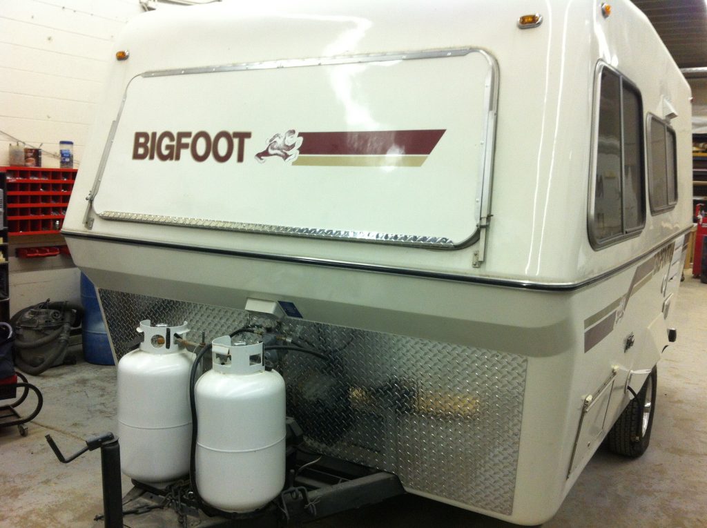 These Bigfoot owners discovered water leaking through their propane compartment and entrance door, which caused a soft floor due to wood rot. The renovations included removal of all lower cabinets and all compromised wood products, then new insulation, plywood and linoleum. The interior shell required fiberglass floor framework. All roof seals were completely removed, cleaned and all the roof accessories were re-coated. New floor, new adventures!