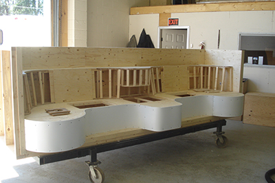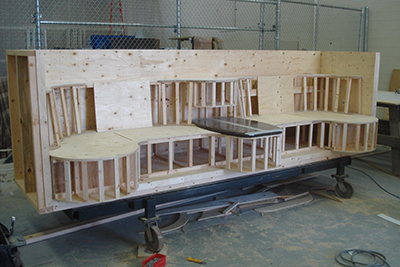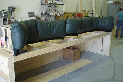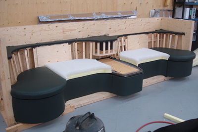 Bigfoot LX removal of the factory slide room furniture and layout. Gilmay RV removed the free standing table and chairs, power sofa, front free standing swivel chair and ottoman to install their new custom hand built leather sofa with swivel chaise. The Bigfoot LX owners living in the Southern US and needing their RV, Gilmay RV Repairs built a mock-up slide room in order to build the sofa. Working closely with Andrew from Distinctive Upholstery, the project came to fruition. Some of the features of this project were the use of high quality ultra leather, multipurpose kitchen/counter surface, individual divided laptop holders with power supply and slide-out drawers on heavy duty ball bearings. Plus the chaise sofa in RV mode or swivel lower section to enter the chassis cab. The results were awesome!